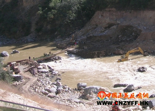 随后,6-7支300多人的采金队伍相继开进水洛河,采金用的挖机、推土机、摇床等大型采金设备,开始对水洛河河的两岸和河道进行挖掘。随着淘出来的金子越来越多,银河矿业有限公司公司又增加了一支采金队伍,每天日以继夜地在水洛河河中淘金——仅10公里的河道上,布满了10支600多人的采金队伍。水面上几乎全是黑压压的机械设备和人员。