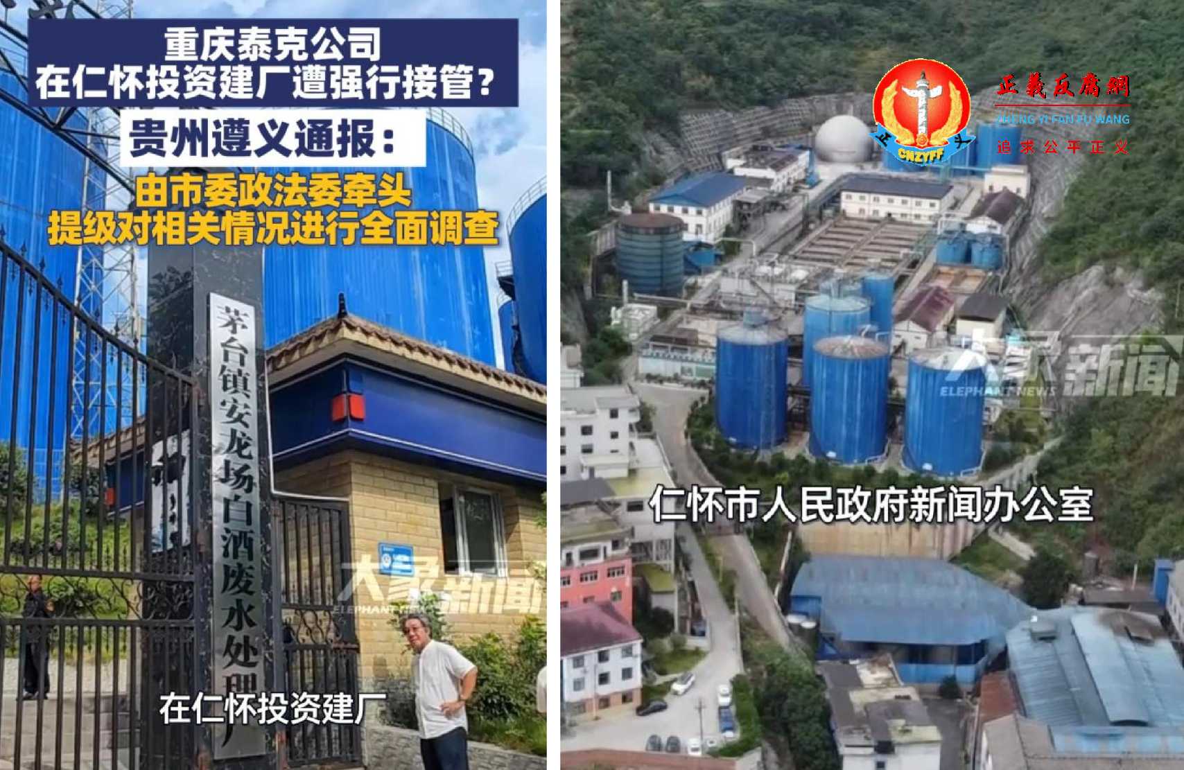▲重庆泰克环保科技股份有限公司与贵州省仁怀市茅台镇政府签约,投资8亿元人民币建成的污水处理厂遭地方政府单方面毁约并强行接管。(图片来源:视频截图 / 合成)