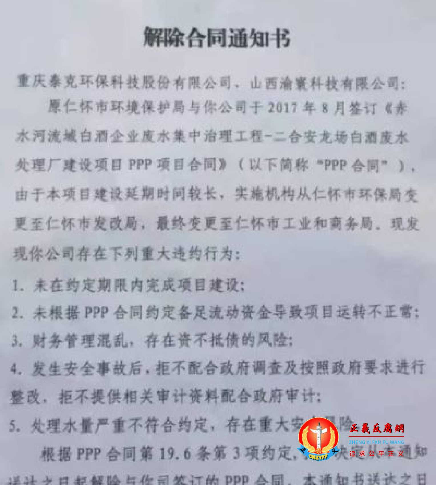 然而,就在这座工厂可以正式投入运营几天后,仁怀市工业和商务局(下称“工商局”)突然在2022年6月10日单方面下发了一份“解除合同通知书”,声称重庆泰克方“存在重大违约行为”,即日解除所签订PPP项目合同,并下令重庆泰克一方的人员在两小时内收拾私人物品离开,不得再进入厂区。当天,仁怀市工商局就强行接管了整个废水处理厂。